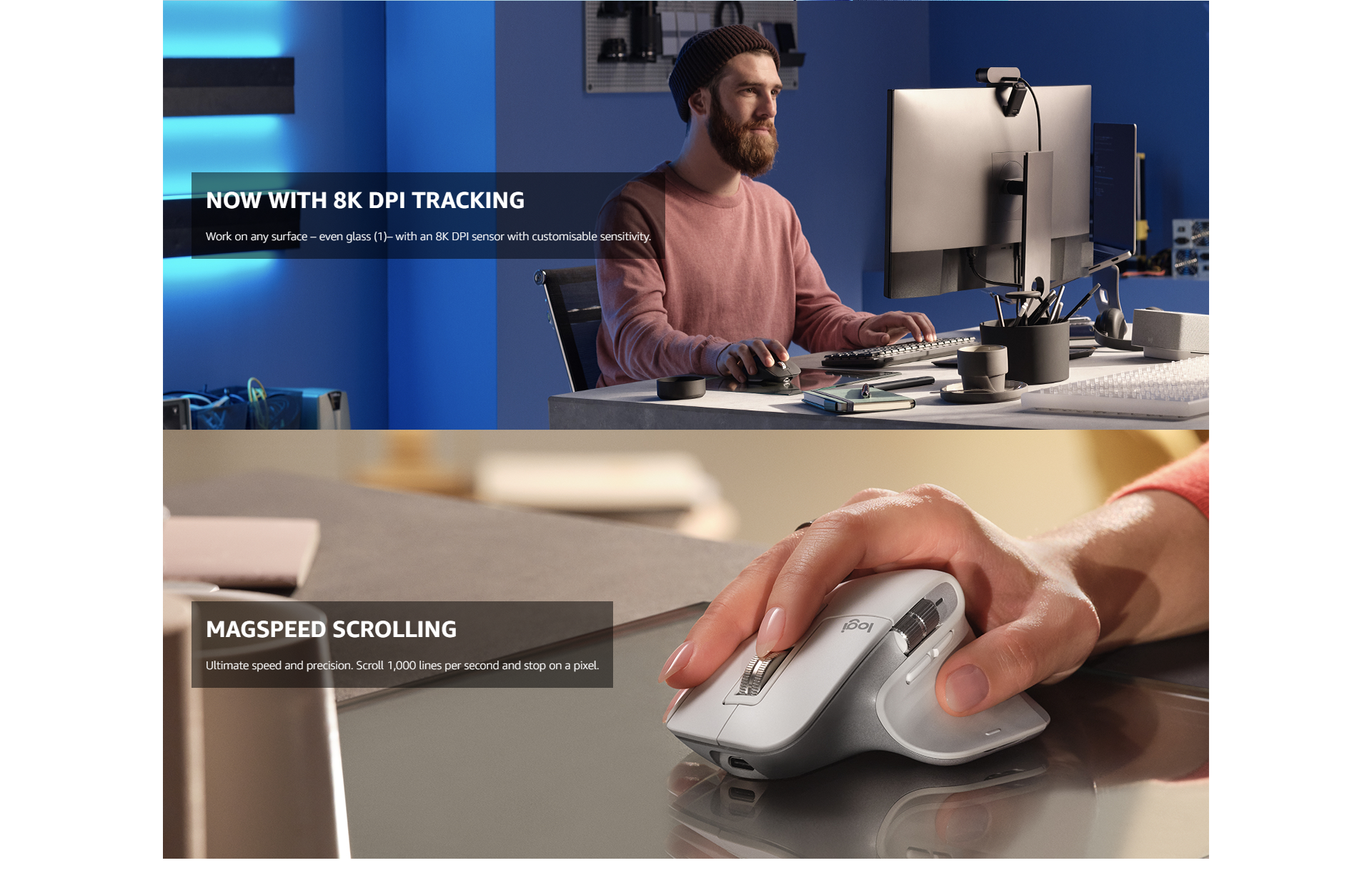 - Suivi Toute Surface - DPI 8K: Utilisez la souris d'ordinateur sans fil MX Master 3S pour travailler sur toutes les surfaces même le verre. Avec 8000 capteurs DPI et sensibilité personnalisable