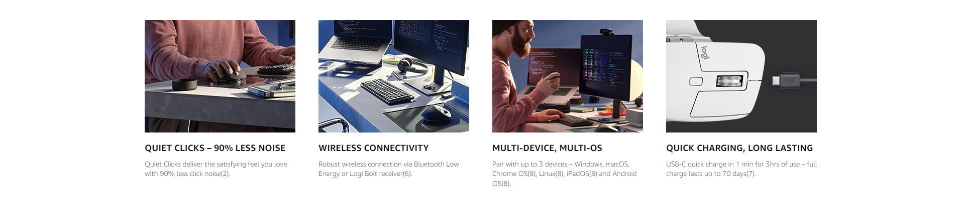 - Clics Silencieux: La souris Bluetooth MX Master 3S présente des clics silencieux, offrant la même sensation de satisfaction mais avec 90% de bruit de clic en moins