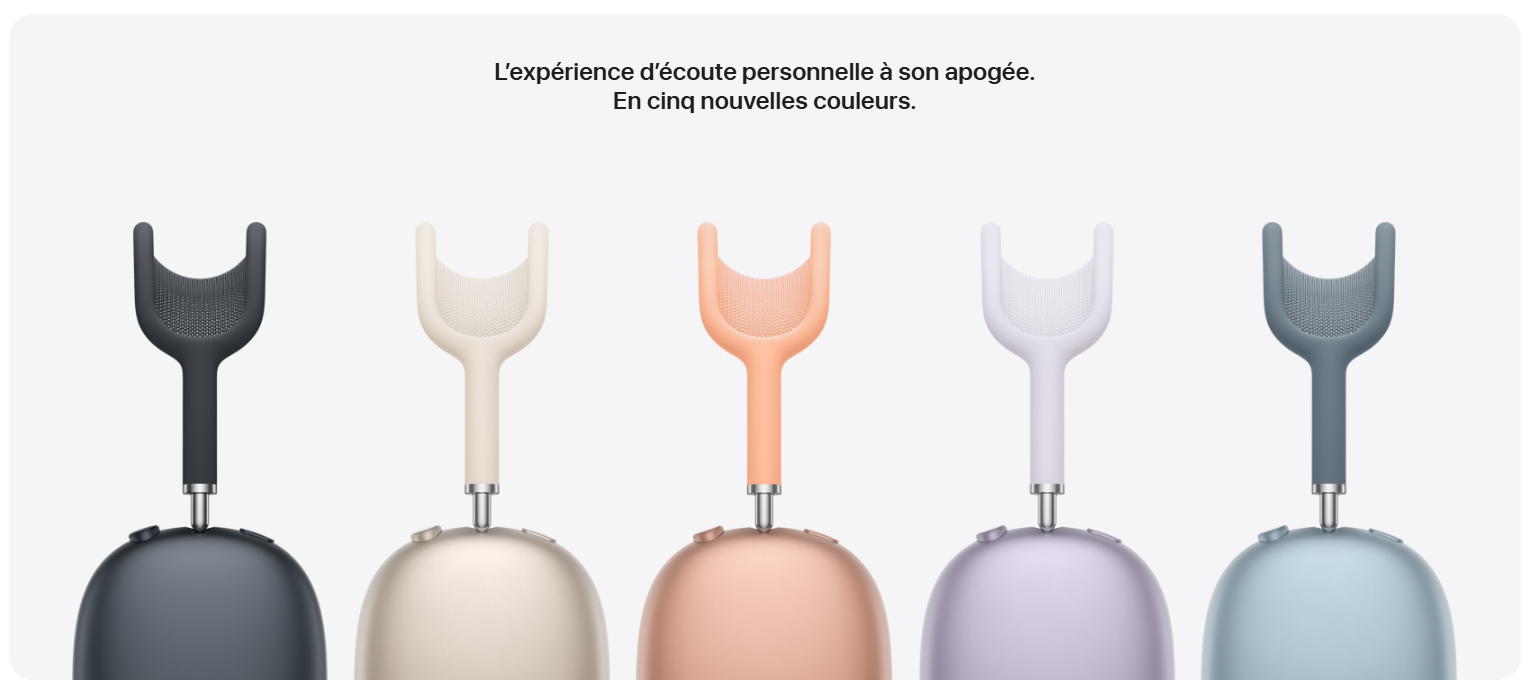 - CINQ NOUVELLES COULEURS. Les AirPods Max sont disponibles en cinq nouvelles couleurs : Minuit, Lumière stellaire, Bleu, Mauve et Orange. Une Smart Case assortie est incluse.