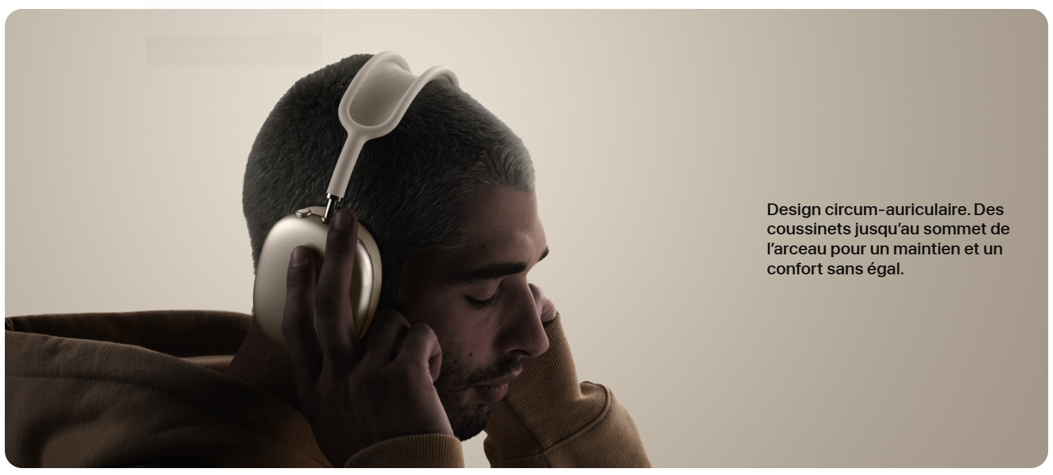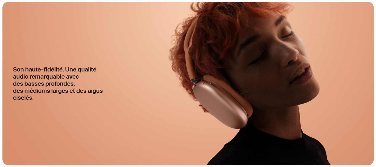 - AUDIO SPATIAL PERSONNALISÉ. Avec un son qui s’adapte parfaitement à la forme unique de vos oreilles et un suivi dynamique des mouvements de la tête, les AirPods Max offrent une expérience d’écoute immersive grâce à un son enveloppant à 360°. Vous pouvez également écouter certains morceaux, ou regarder des séries et films, en Dolby Atmos.