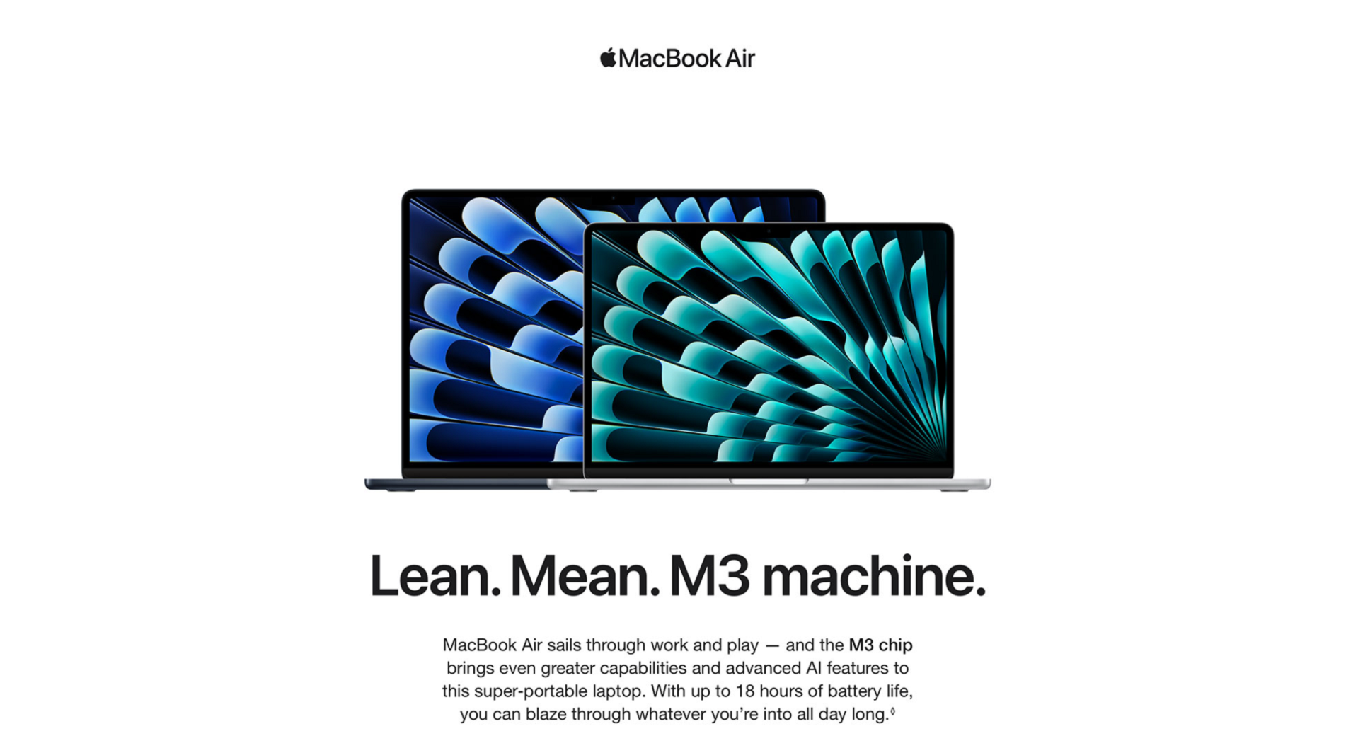 • POIDS PLUME. PUISSANCE M3 – Super portable et super rapide, le MacBook Air avec puce M3 vous permet de travailler, de jouer et de tout faire comme jamais.