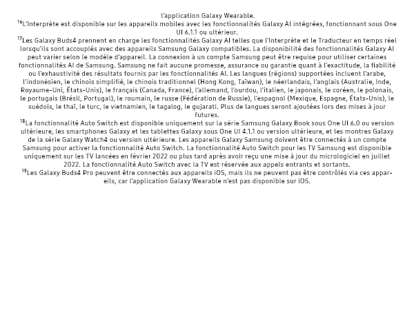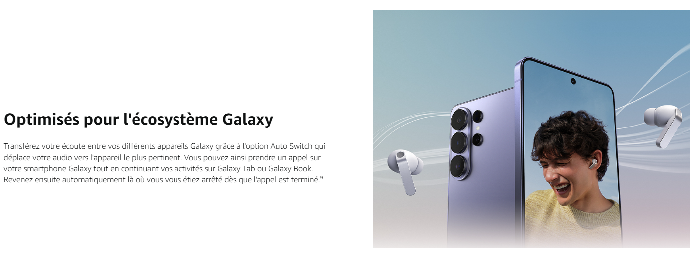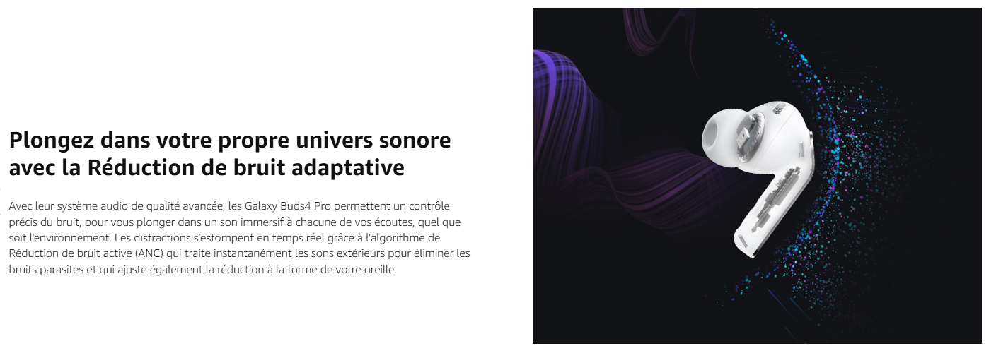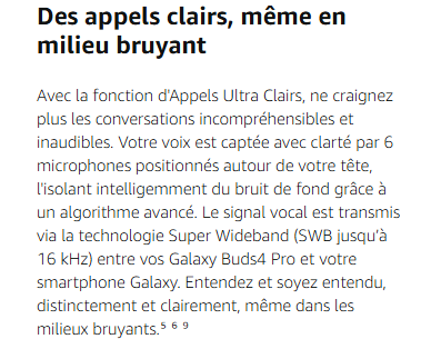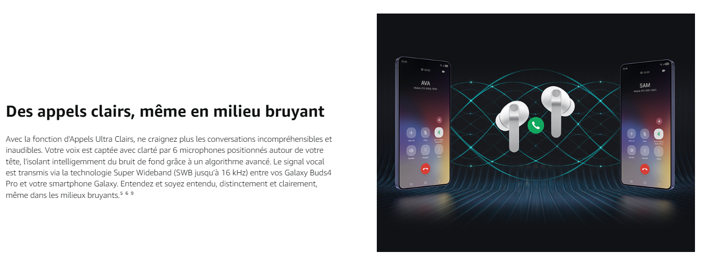 - DES APPELS ULTRA CLAIRS MÊME EN MILIEU BRUYANT : Nos Galaxy Buds4 Pro et la technologie Super Wideband rendent vos conversations claires même dans les environnements bruyants ; votre voix est captée et isolée, puis retransmise sans les bruits alentour⁵ ⁶