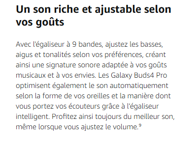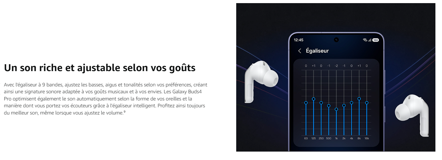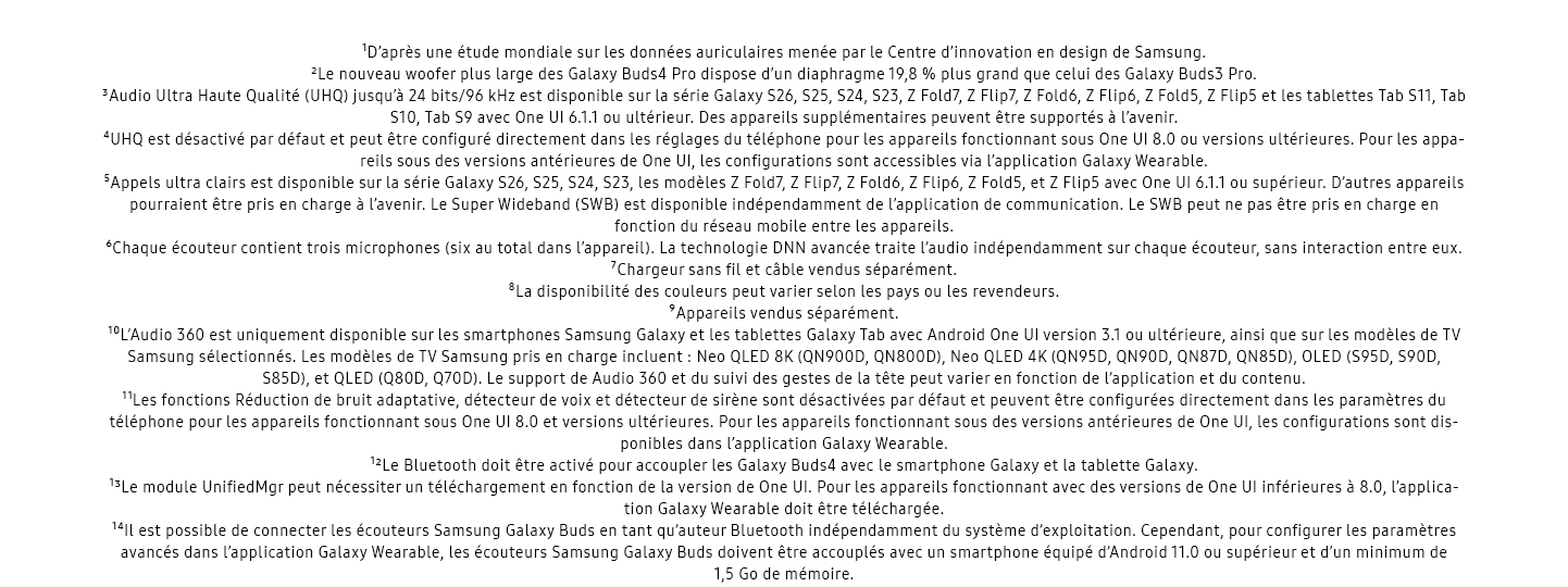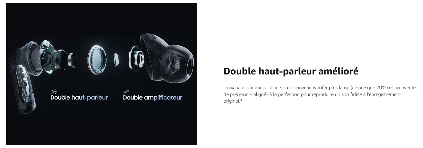 - UN SON STUDIO SANS COMPROMIS : Avec deux double haut-parleurs améliorés, les Galaxy Buds4 Pro délivrent un son capturant chaque fréquence, avec moins de distorsion ; le double amplificateur aide à minimiser les interférences pour un son fidèle et une écoute digne d'un studio²