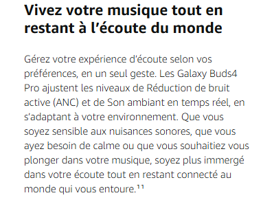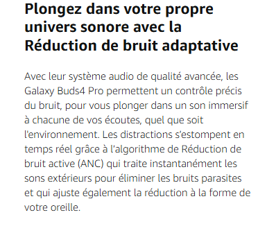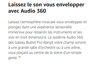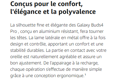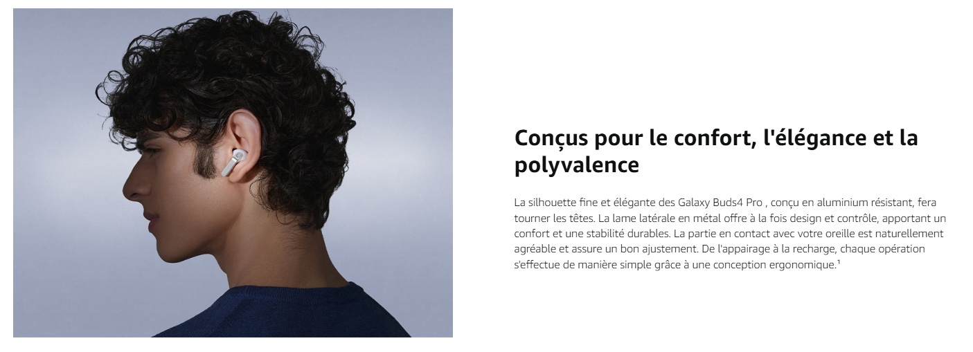 - DESIGN SIGNATURE GALAXY BUDS : Les Galaxy Buds4 Pro de Samsung sont dotés de lames latérales en métal qui, en comparaison aux Galaxy BudS3 Pro, créent une silhouette affutée qui reste confortable du matin au soir.¹