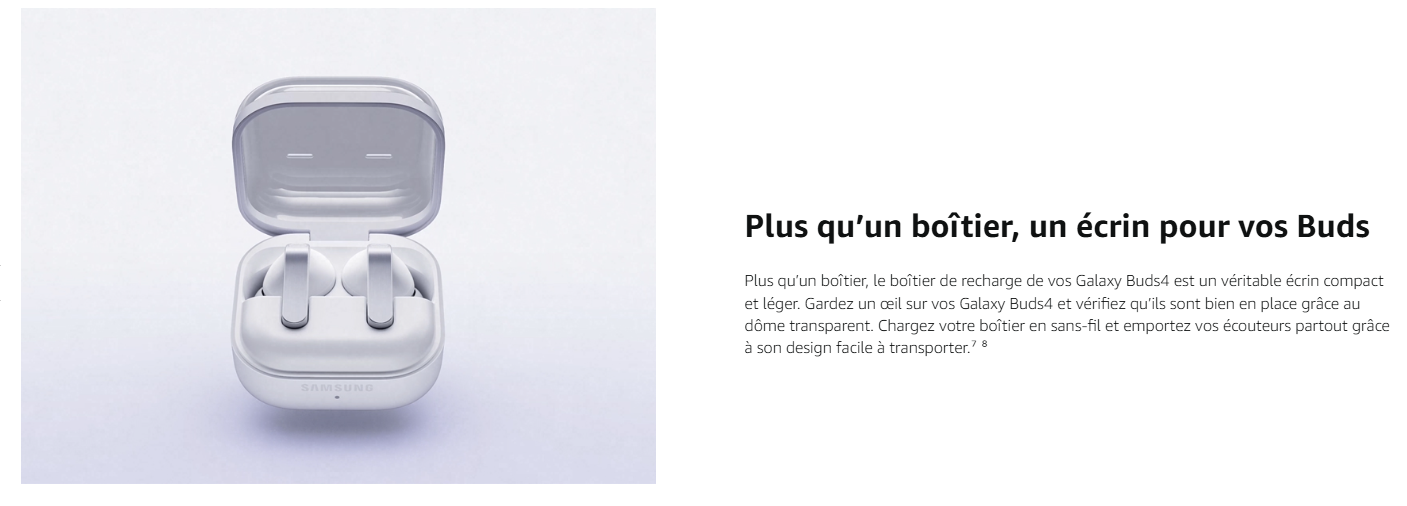 - PLUS QU'UN BOÎTIER, UN ÉCRIN : Compact et léger, l'écrin des Galaxy Buds4 Pro vous suivra partout, tandis que son design transparent permet de vérifier en un coup d'œil si vos écouteurs sont bien en place et s'il chargent correctement en sans-fil⁷