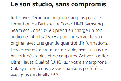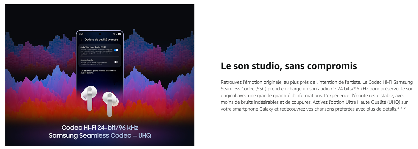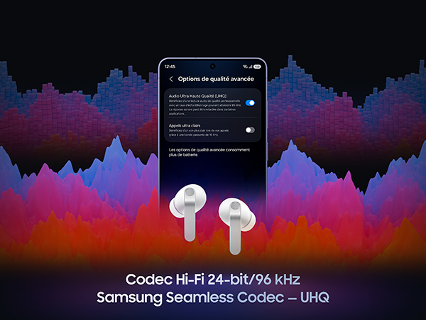 - UN SON HI-FI ULTRA HAUTE QUALITÉ : Profitez d'un son Hi-Fi proche de l'original, riche et gardant tous ses détails grâce au Samsung Seamless Codec et à l'option audio Ultra Haute Qualité (UHQ) prenant en charge le son Hi-Fi jusqu'à 24 bits / 96 kHz³ ⁴